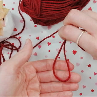 Dann lege deinen Faden zu einer Schlaufe. Halte diese Schlaufe mit der linken Hand (Linkshänder auch gerne mit der rechten). Dann gibst Du das Fadenende mit der rechten Hand von unten durch die Schlaufe. Ziehe den Faden aber nicht komplett hindurch. Denn so entsteht eine neue Schlaufe. Diese neue Schlaufe ist Deine erste Masche! Halte die neue Schlaufe mit der rechten Hand gut fest.
