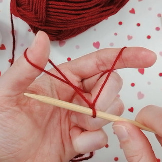 Daumen und Zeigefinger der linken Hand tauchen beide zwischen die beiden Fadenenden, die sich zwischen der rechten Stricknadel und der linken Hand spannen. Daumen und Zeigefinger führen diese Fadenenden auseinander und dadurch zieht sich die erste Masche an der Stricknadel fest.